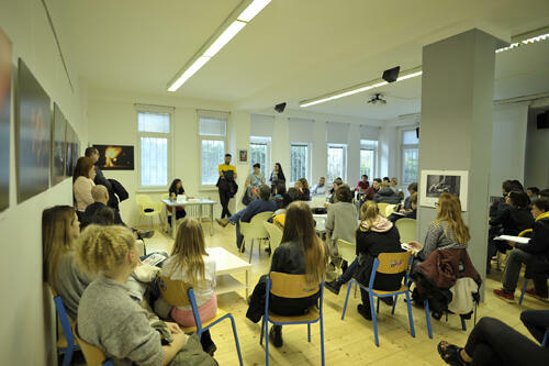 V reklamním klubu proběhlo setkání s rodičů a žáků s vedením školy, kde jim byla poskytnuta řada informací o studiu. Přítomné zaujaly zmínky o stážích a projektech, především o Erasmus+. Následné dotazy směřovaly především k přijímacímu řízení a blížícím se talentovým zkouškám.